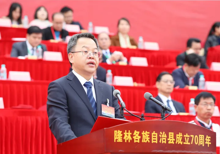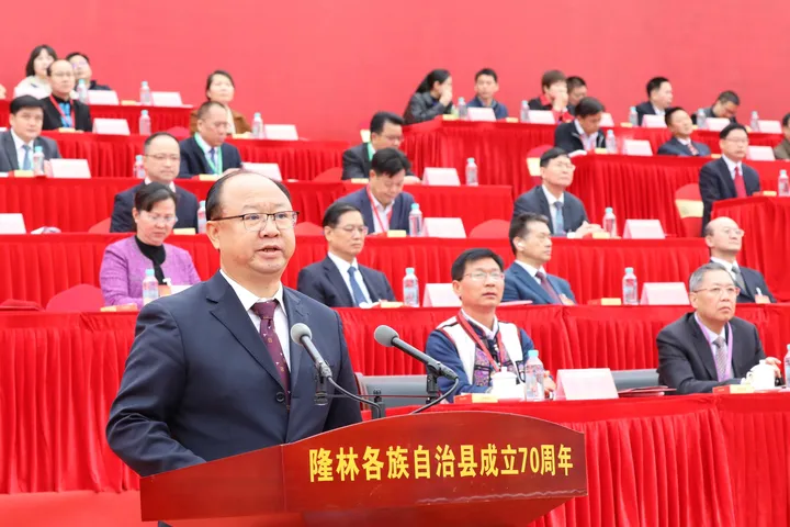 ![]() 王心富致辞。 王心富指出,70年来特别是党的十八大以来,在隆林历届党委政府的团结带领下,勤劳智慧的隆林各族儿女共同奋斗,推动各项事业蓬勃发展,取得了巨大成就。今日之隆林,生机盎然,百业俱兴,呈现出一派蒸蒸日上、欣欣向荣的喜人景象。今日之隆林,人民生活更具品质更有品位,幸福山歌响彻城乡大地。今日之隆林,山清水秀生态美,人与自然和谐共生,绿色家园更加美丽宜人。今日之隆林,各民族像石榴籽一样紧紧抱在一起,唱响了“共同团结奋斗、共同繁荣发展”的生动旋律。王心富要求,隆林各族自治县要全面贯彻落实党的二十大精神,加快建设社会主义现代化隆林,共同擘画新时代新征程隆林发展的壮美画卷!