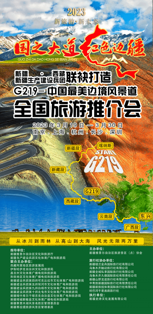 ——G219 中国最美边境风景道”全国推介会 2023年3月19日-3月30日,帕米尔旅游区参加由新疆维吾尔自治区文化和旅游厅、新疆生产建设兵团文化和旅游局指导、新疆、西藏阿里地区G219沿线相关单位联合主办的第三届“国之大道∙红色边疆—G219 中国最美边境风景道”全国推介会走进南京、上海、杭州、长沙、深圳等五大地市,对重点客源城市进行旅游宣传、推介,进一步加强与重点客源城市对接交流与旅游合作。 本次五大城市旅游推介大会上,景区将通过旅游宣传片、景点内容推介、游玩线路推介、民俗文化交流等方式,介绍了塔县帕米尔旅游区全域旅游资源产品,希望让更多的旅游企业能够参与到塔县旅游事业的大发展当中,我们诚邀天下四海宾朋远赴山海,去那天边的尽头帕米尔高原上探秘观光。