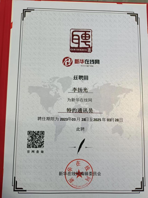 2023年3月28日新华在线网聘请李扬光为特约通讯员,统一编号:XHP230303A,职务:特约通讯员,聘期:两年,从2023年3月28日至2025年3月28日。
