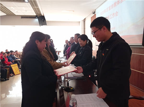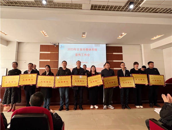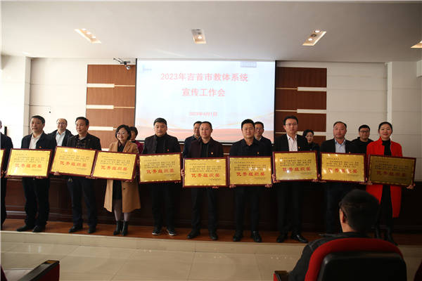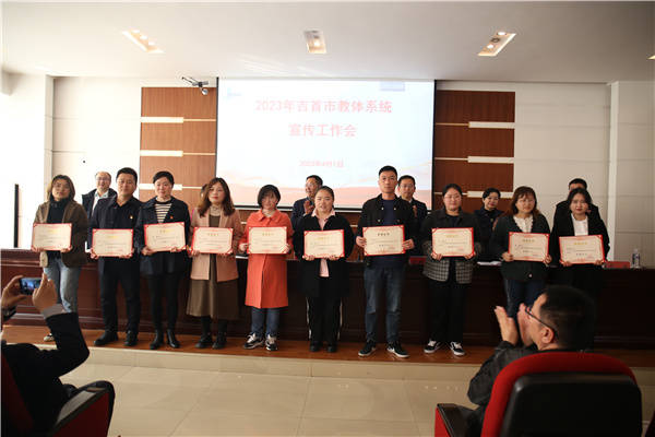 为全面总结2022年教体宣传工作,部署安排2023年工作任务,进一步统一思想,为推动全市教体事业高质量发展凝心聚力。 4月1日,吉首市教体局党委召开全市教体系统宣传工作会。对2022年度州、市教体好新闻,州、市教体宣传和信息工作先进单位、先进个人,市教体系统“喜迎二十大、奋进新征程”书画、摄影、民间工艺作品主题活动先进单位等进行表彰。