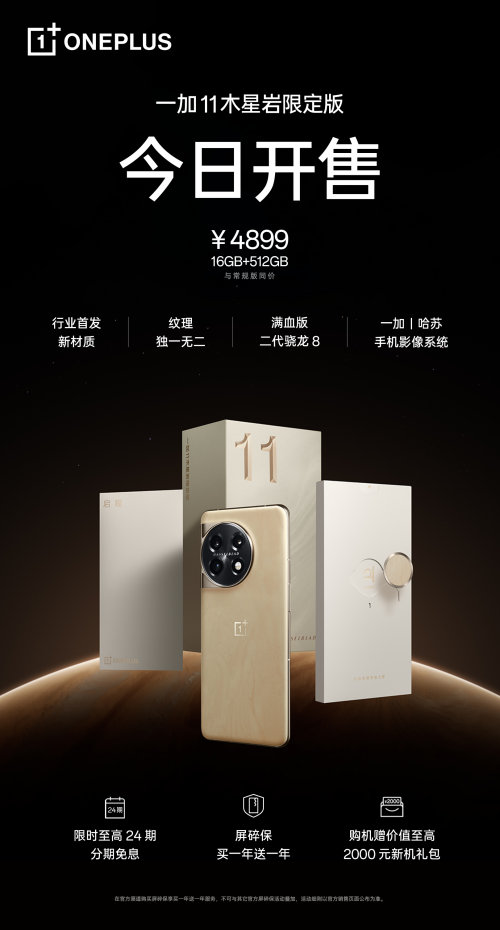 一加 11 木星岩限定版采用第二代骁龙 8 移动平台,搭载内存基因重组技术、超帧超画引擎、仿生振感马达、游戏云计算专网四大自研黑科技,在内存管理、游戏画质、马达体验、弱网游戏上打破安卓手机体验的四大不可能。目前一加 11 木星岩限定版已经开售,16GB+512GB 版本售价 4899 元,现在购买可享至高 24 期分期免息,购屏碎保买一年送一年,还有至高 2000 元新机礼包,用户可在 OPPO 商城、京东、天猫及一加线下授权门店等全渠道进行购买。 |