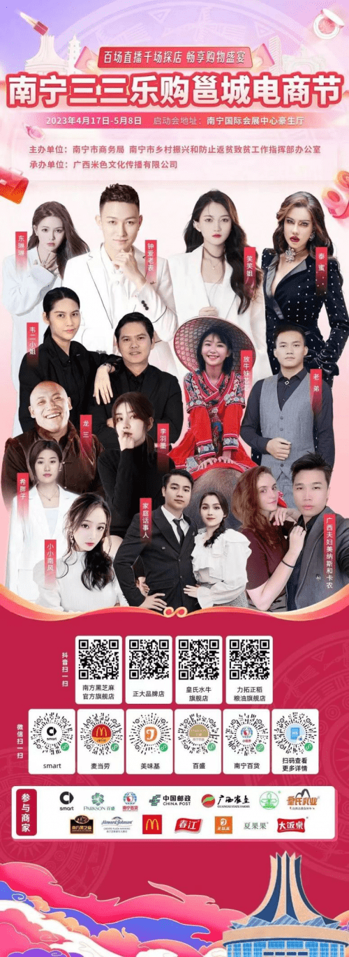 网红达人直播带货、直播探店、200家南宁名优特产企业、200家餐饮美食企业、20位区内外头部主播…… 为拉动消费、促企增效、助农增收南宁市商务局、市乡村振兴和防止返贫致贫工作指挥部办公室在壮族三月三民族传统节日期间隆重举办“南宁三三乐购邕城电商节”。百场直播千场探店,畅享购物盛宴你准备好了吗? 2023年南宁三三乐购邕城电商节 活动时间:4月17日至5月8日