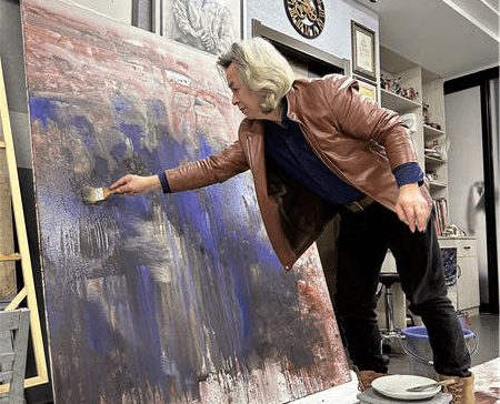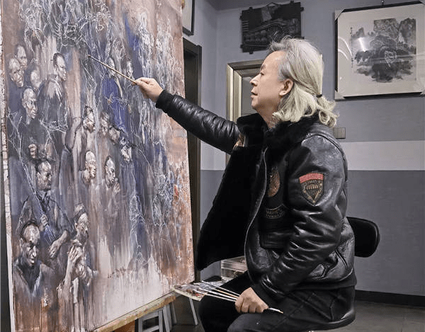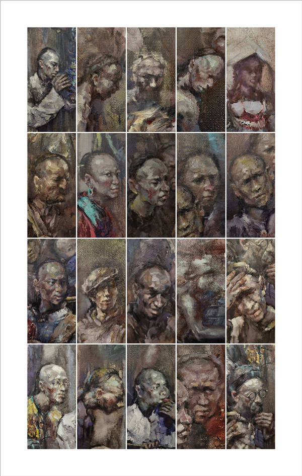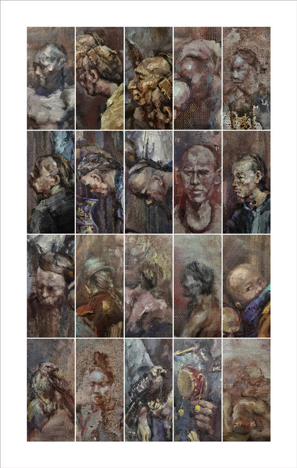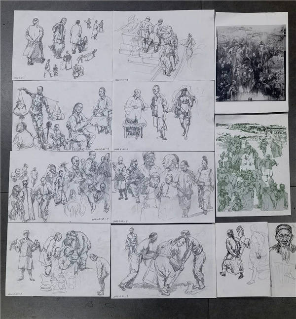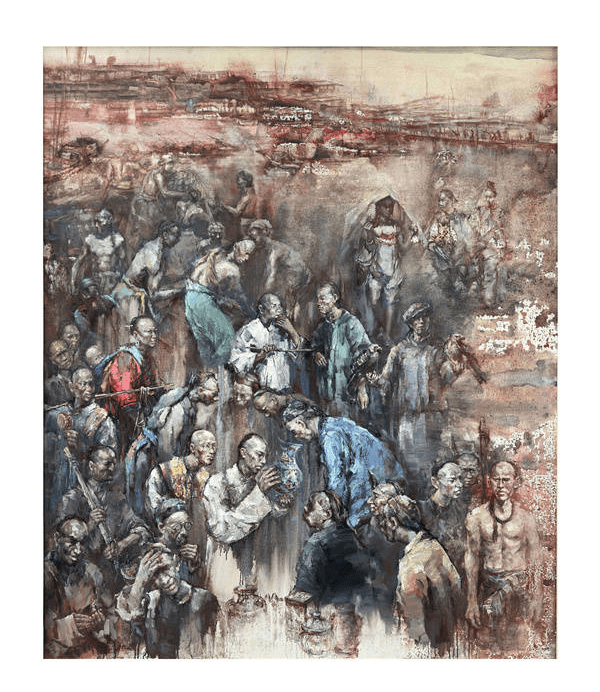 今年,孙青峰老师新作油画《梦回九江府-码头》,画面气势恢宏,形象丰富,各色人等栩栩如生。以中国画的“泼彩”手法为基调,泼出似有若无的九江码头作为整幅作品的背景。再在画面中心,以散点视角精描人物。神采毕现,内涵丰富。 孙老师說:“每个时代必然造就每个时期的人物形象,不光在衣着打扮上,更在人物的神态与气质之中,因此,艺术家必须认真做好画前功课”。在查阅了大量的历史照片资料后,数十位不同造型和身份的形象了然于胸,然后精心勾勒于草图之上。主体人物神情各异,特征尽情凸显。画面布局层次分明、错落有致,虚实互补、相得益彰。作品在深入刻画的表现上,充分利用油画的厚叠技法配合刮刀使用,使画面主次相宜,厚薄相映,厚实而不僵,松弛而不散,充分表达其典型的个人語言及审美共性。