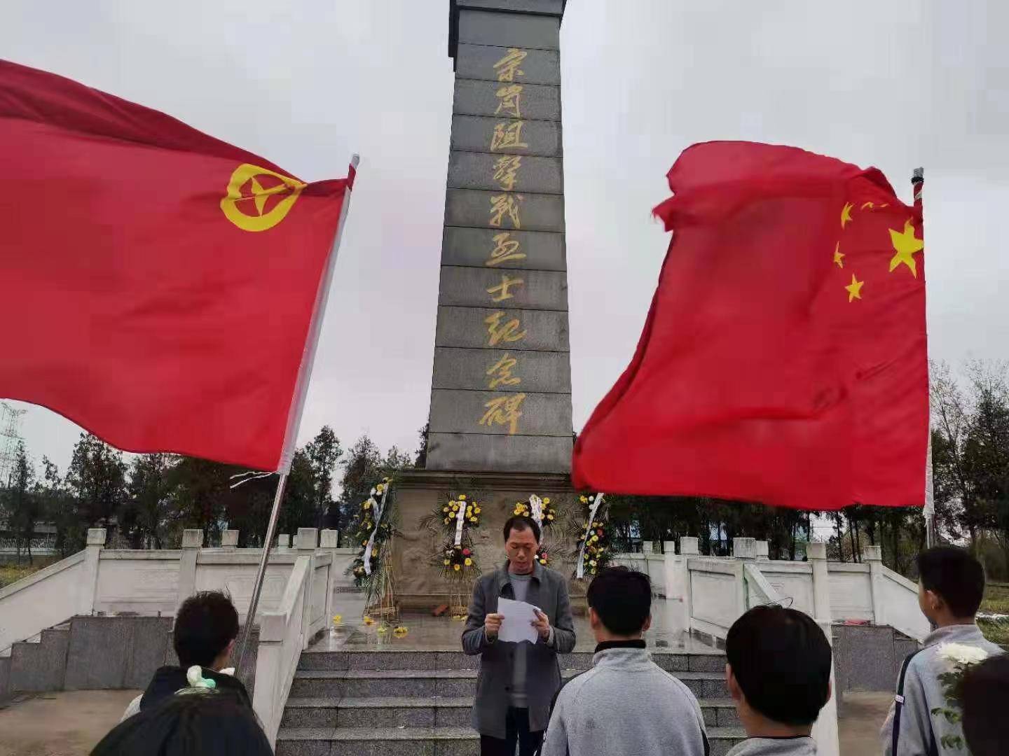 为了对学生进行爱国主义教育、感恩教育和励志教育,激发学生对革命先烈们的崇敬和怀念之情,树立正确的世界观、人生观、价值观,3月29日上午,盱眙县铁佛中学政教处组织400余名师生,徒步前往距离学校15公里的革命老区——宗岗烈士陵园,开展以“缅怀革命先烈,弘扬中国精神,争做强国少年”为主题的清明祭扫社会实践活动。 在烈士纪念碑前,优秀学生代表怀着崇敬的心情向革命烈士敬献花篮和鲜花。全体师生列队默哀致敬,瞻仰革命英雄,缅怀革命先烈,面对雄伟的纪念碑和鲜艳的五星红旗进行了庄严的宣誓。