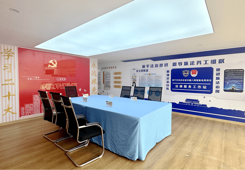 据悉,南宁市良庆区驻中建八局广西智能电网项目“法律服务工作站”是良庆区打造的在工地上的示范性服务站,该工作站集法治宣传大讲堂、多元调解室等服务功能于一体,将以“普法+协助”的工作模式,切实发挥其普法、法律援助、调解等作用,真正守护广大农民工的“薪”,切实让农民工不忧“酬”。