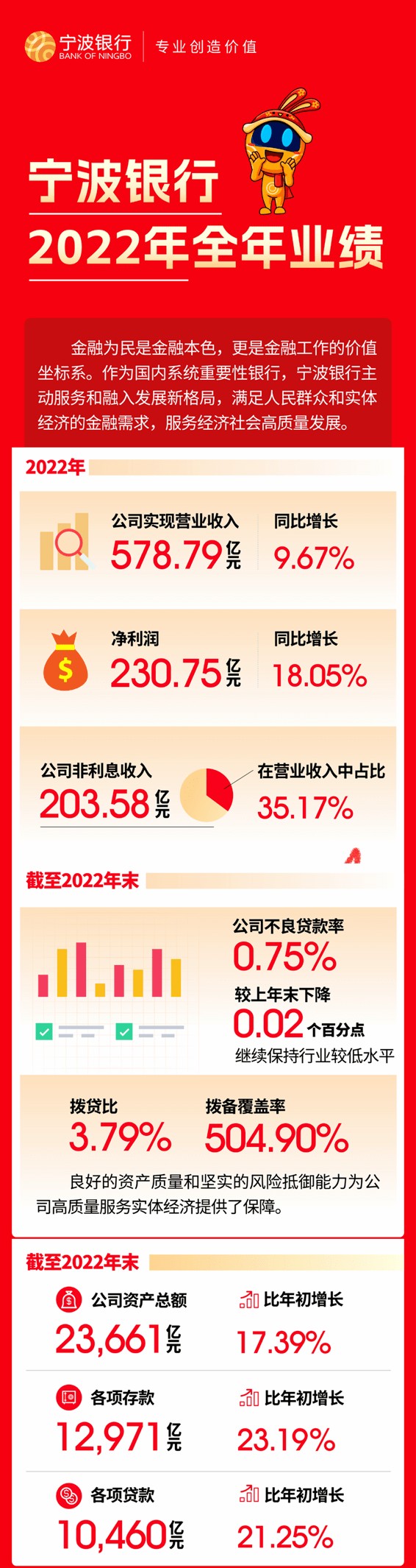 宁波银行4月5日正式披露2022年年度报告:该行实现归属于母公司股东的净利润230.75亿元,同比增长18.05%,公司总资产23660.97亿元,不良贷款率0.75%,拨备覆盖率504.90%,资产质量继续保持业内较好水平。公司拟向普通股股东派发现金红利,每10股派发现金红利5元(含税)。