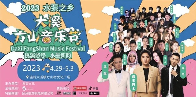 党建引领聚合力,联建共建促发展 2023水泵之乡大溪方山音乐节4月29日-5月3日盛大启幕 摇滚、说唱、流行,加入音乐狂欢,感受青春炽热! 一场关于初夏、音乐与热爱的故事,正在延续。 因为热爱,所以相遇; 这个初夏,在方山延续初夏浪漫; 掀起舞台热浪,准备好和我们共赴大溪方山之约了吗? 地址:浙江省温岭市大溪镇方山村方山文化广场 演出时间:19:00-22:00 ![]()