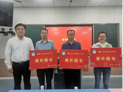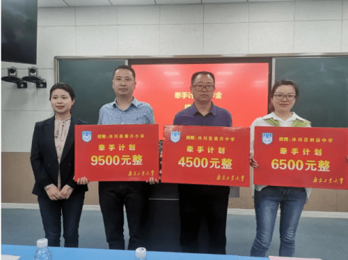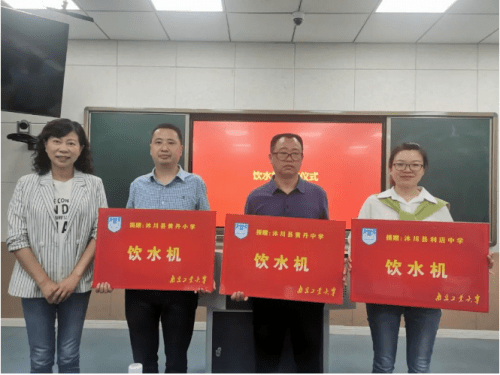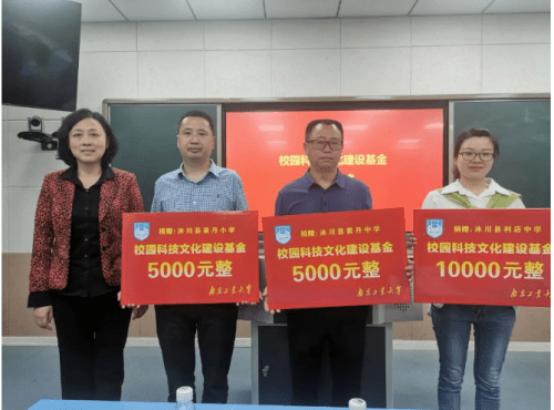 在捐赠仪式上,南京工业大学团委副书记乐凤,南京工业大学对外合作与发展处副处长、校友工作办公室副主任凌红,南京工业大学党委研究生工作部部长、研究生院常务副院长张广明,南京工业大学党委常委、副校长戴志晖分别将捐赠物资和基金送到黄丹小学、黄丹中学、利店中学代表手中。