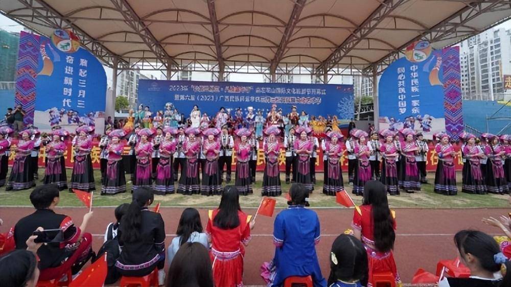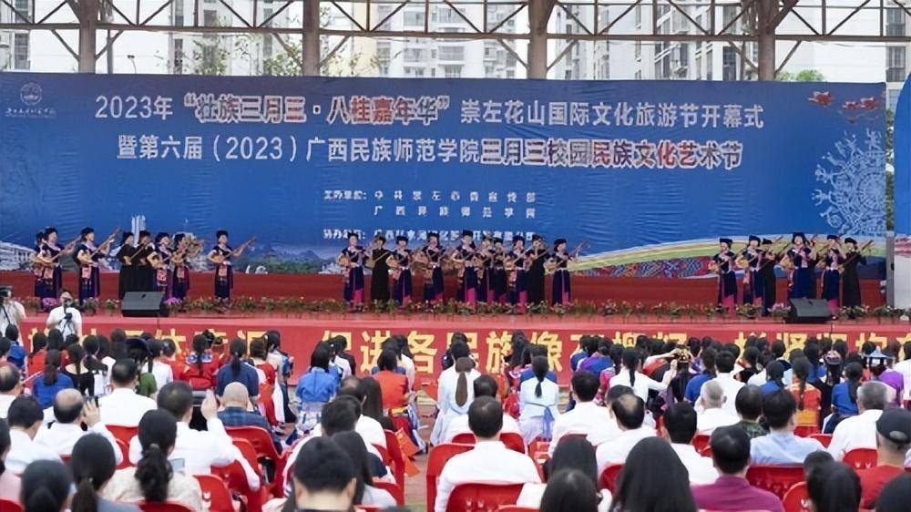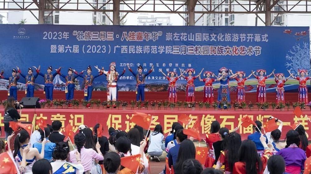 “尼的呀,尼的呀,美丽的广西谁能不爱它……”伴着优美的旋律和动听的歌声,2023 年“壮族三月三•八桂嘉年华”崇左花山国际文化旅游节开幕式暨第六届(2023)广西民族师范学院三月三校园民族文化艺术节于4月18日在广西民族师范学院举行。