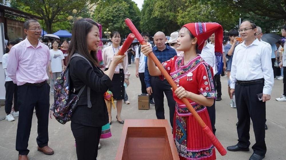 (茶艺展示) 感受非遗魅力,弘扬传统民俗文化。 崇左是骆越文化的发祥地,“壮族三月三•八桂嘉年华”崇左花山国际文化旅游节的开幕拉开了“壮族三月三”崇左节日的喜悦氛围,更是让广大群众得以近距离接触非遗瑰宝,了解和欣赏非遗文化,感受非遗魅力,弘扬传统民俗文化。 学校是传承非遗的重要载体之一,为了深入推进非物质文化遗产保护, 由红水河文化旅游开发有限公司牵头从2023年2月开始就陆续在广西民族师范学院,都安瑶族自治县职业教育中心、南宁市明秀小学等开展“非遗进校园系列活动”,包括将特色非遗项目引入课堂,定期邀请非遗传承人走进校园开展非遗民族医药文化讲堂,非遗技艺传授等,让传统文化薪火相传。