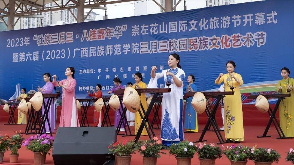 广西民族教育发展中心副主任张海燕,崇左市人民政府副市长白冰冰,广西民族师范学院党委书记梁远海,中国网上电视台绿色广西频道总监、校园民族文化艺术节总导演王杰清等嘉宾领导、学校师生及各高校师生、区内各级媒体欢聚民师,共同畅游在“三月三”山歌的海洋中,共同见证这座城市的文化魅力和发展成果。 载歌载舞庆佳节,民俗盛宴壮韵浓 18日当天上午,广西民族师范学院的壮乡学子以敬酒、献绣球、多耶舞、龙狮舞动等传统民俗活动喜迎各方嘉宾亲朋的到来。随后,一场以舞台上千人对歌,舞台下万人和歌,采用混合剪辑的形式,形成跨时空合唱拉开了艺术节的帷幕。来自原生民歌表演团、民族舞蹈团、独弦琴表演艺术团、广西民族师范学院的演员依次表演了天琴弹唱、独弦琴弹唱、歌曲、舞蹈等十余个节目。舞台上节目精彩纷呈,舞台下观众掌声不断。尤其是壮族天琴弹唱《三月请到壮乡来》、《请你对山歌》、《天之琴》,京族独弦琴弹唱《过桥风吹》,尽情演绎了非物质文化遗产的魅力,用音乐和歌声展示了壮美新广西;歌舞《酒歌》则充分展现了壮族人民的“歌海”文化;《学唱山歌小阿妹》接过民族文化传承的接力棒,用文艺振奋民族精神……一个个独具民族特色的节目表现了壮乡儿女对伟大祖国、对美好生活的歌颂和感恩之情。