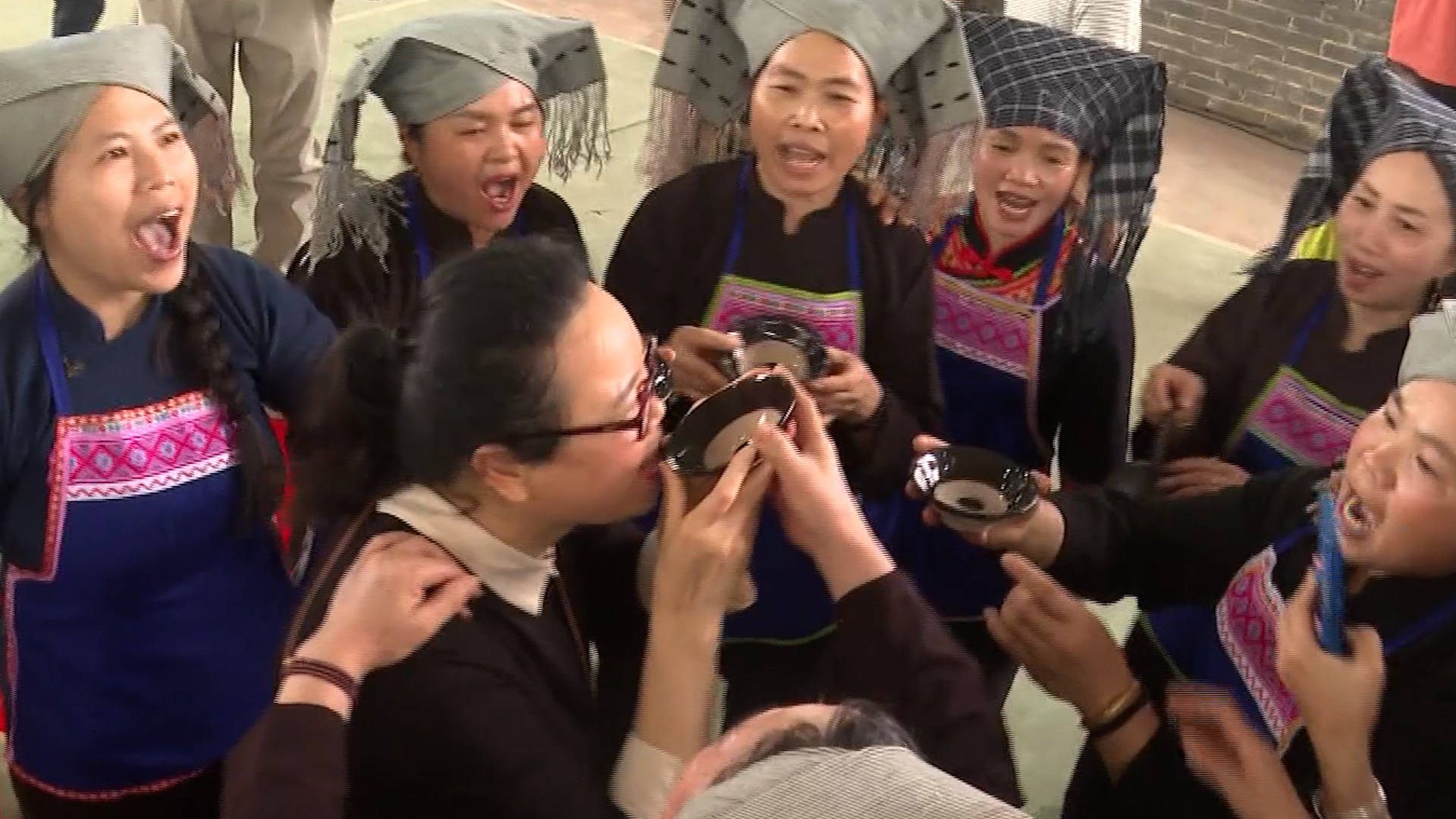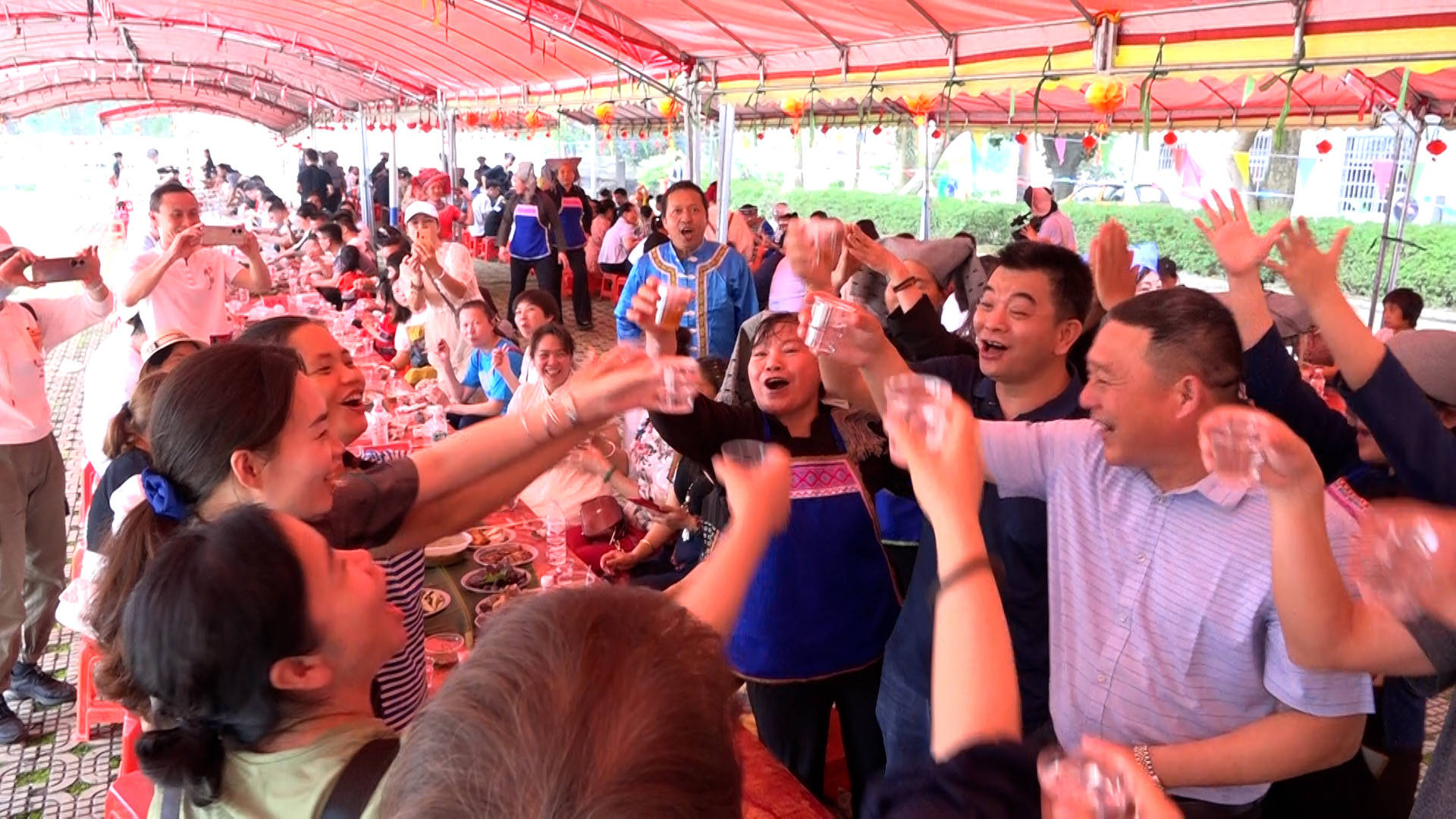 除了五色糯米饭,最令人神往的就是三月三压轴大戏,特色美食长桌宴。五六十米的长桌坐满了来自洋桥镇各民族的代表以及八方宾客,桌子上铺满各种原汁原味的特色美食佳肴,大家在尽情享用丰盛美味的同时,独具特色的少数民族祝酒游戏也融入到了热闹的长桌宴中,让游客们深度感受到了“三月三”节庆的浓厚氛围和壮族文化的独特魅力。