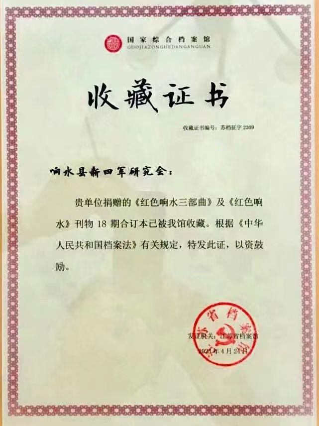 ![]() 跨时空穿越,感受沧海桑田历史巨变。江苏省响水县作为参会不多的县份,该县新四军研究会常务副会长王万佳在会上作了《红笺小字为忠魂》的专题学术交流发言,讲述了响水红色故事,交流了口述史《红色响水三部曲》和《红色响水》等研究成果。 ![]() 新出版的《响水红色地标》《响水英烈风采》《响水烽火岁月》组成的红色响水三部曲,以老兵和知情人的口述为史料,以纪实文学的形式,记录了响水100多年来的革命历史,全书100万字,近200多帧历史图片。慎终追远,回望百年,彰显着革命老区的地域激情和百年荣光,是对广大人民特别是青少年进行理想信念和爱国主义教育的生动教材。 ![]() 响水县新四军研究会花费五年心血,抢救挖掘出来的响水革命老区红色口述史最新成果——《红色响水》18册合订本, 120万字。 持续讲好“红色故事”,为乡村振兴的中国式现代化培根铸魂。响水县新四军研究会口述史研究成果受到与会专家学者的好评和关注。 ![]() 会议期间,响水县新四军研究会常务副会长王万佳、副秘书长唐树华、何秀华将革命老区红色口述史最新研究成果——《红色响水三部曲》一书和《红色响水》合订本捐给了国家综合档案馆——江苏省档案馆,江苏省档案馆领导向响水新四军研究会颁发了收藏证书。 ![]() 根据议程,本次会议还围绕新中国工业建设口述史与社会主义精神传承、中国早期现代化与张謇研究名家口述历史等主题做了深入交流,并就采录对象选择、访谈技巧、采集标准、语境特色、宣传拓展等多方面进行了理论探讨。