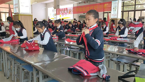 二年级的同学们穿衣服的动作迅速敏捷,佩戴红领巾规范整齐,个个充满自信。