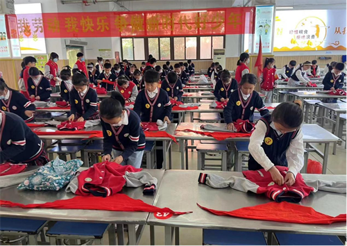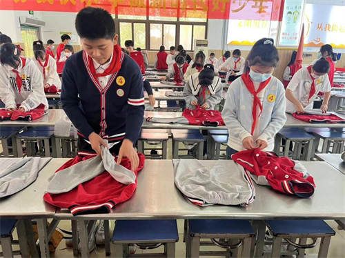 三、四年级的同学们按照比赛要求迅速将整套校服叠好并戴上红领巾,动作一气呵成,展现了劳动小达人的技术水平。