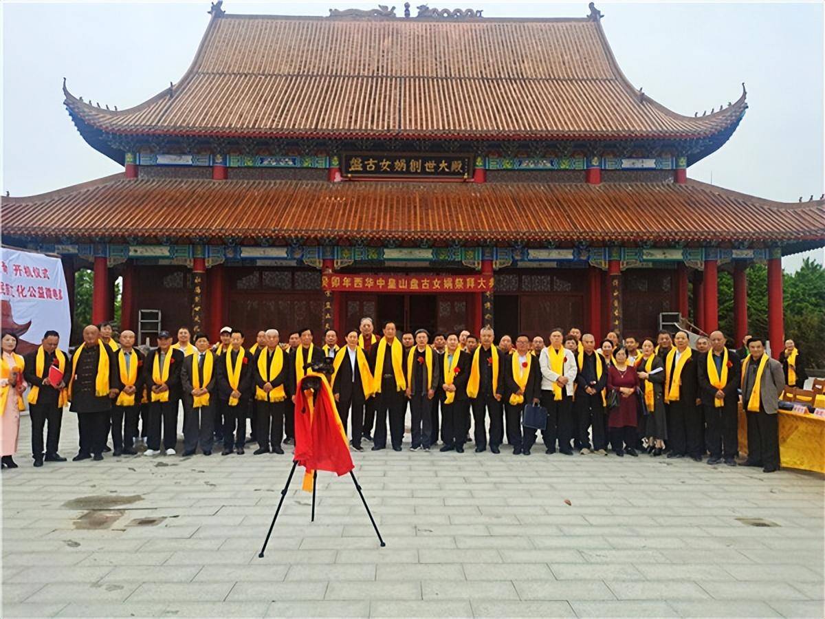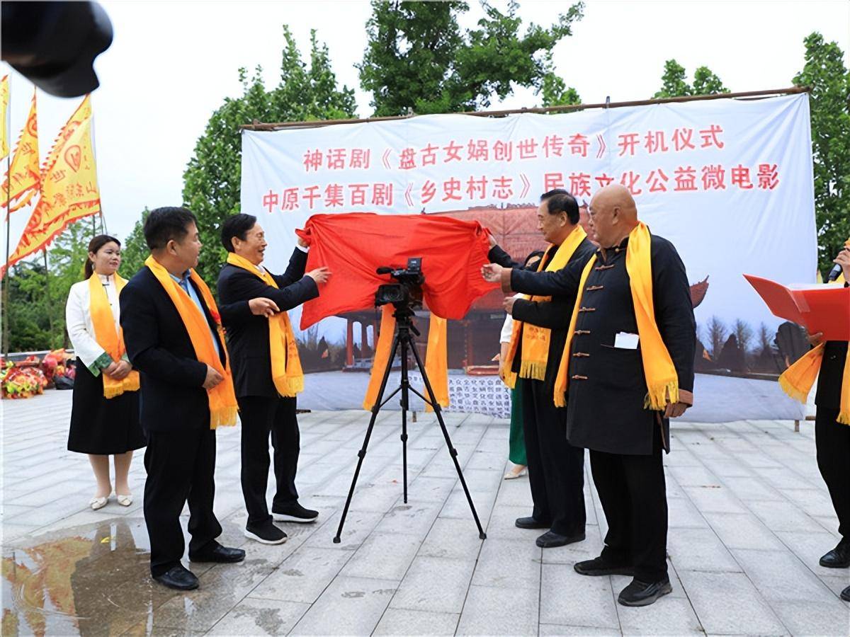 参加开机仪式的嘉宾代表在盘古女娲创世大殿前留影 为了弘扬盘古女娲创世神话文化精髓,继承盘古女娲光耀千秋的创世精神,引领世人认真践行盘古女娲破旧立新的革命精神、敢为天下的创新精神、顶天立地的担当精神、天下为公的奉献精神、合作共赢的协作精神、胸怀天下的包容精神(盘古女娲创世文化研究学者耿宝山总结),有中国大众文化学会盘古女娲创世文化专业委员会、河南中皇山盘古女娲文化研究院、中原千集百剧《乡史村志》公益微电影组委会合作策划的神话剧《盘古女娲创世传奇》开机仪式在河南中皇山古遗址景区举行。