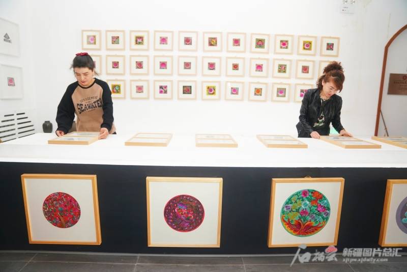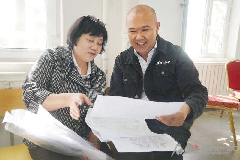 5月10日,哈密市传统工艺工作站,哈密维吾尔族刺绣市级非物质文化遗产代表性项目传承人卡德尔·热合曼(右)看到授课老师崔砾文(左)带来的设计手稿,很兴奋。 哈密市文化馆党支部书记郝常立说:“哈密维吾尔族刺绣作为非物质文化遗产,我们要传承好、保护好、发展好。我们专门请来专家,提升我们绣娘的刺绣技艺和水准,最终能够生产出符合当代审美的畅销产品,实现传承和收益双丰收。”