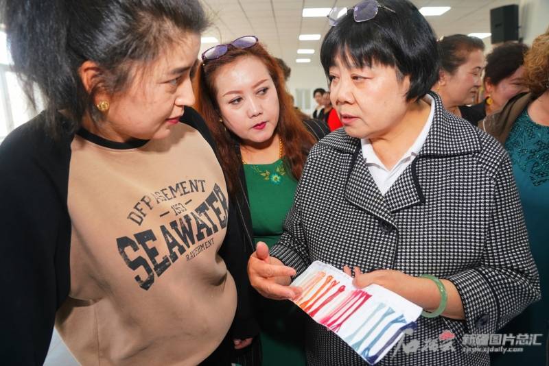 5月10日,哈密市传统工艺工作站,专家崔砾文在给学员们讲解刺绣色彩搭配。