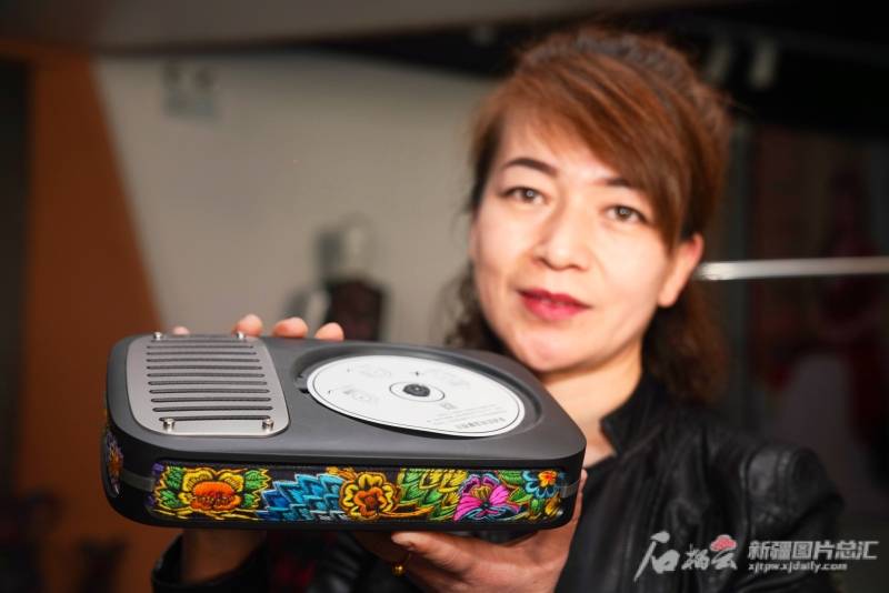 5月10日,哈密市传统工艺工作站传统工艺传习所,一名学员展示早期制作的镶嵌刺绣装饰的CD唱片机。