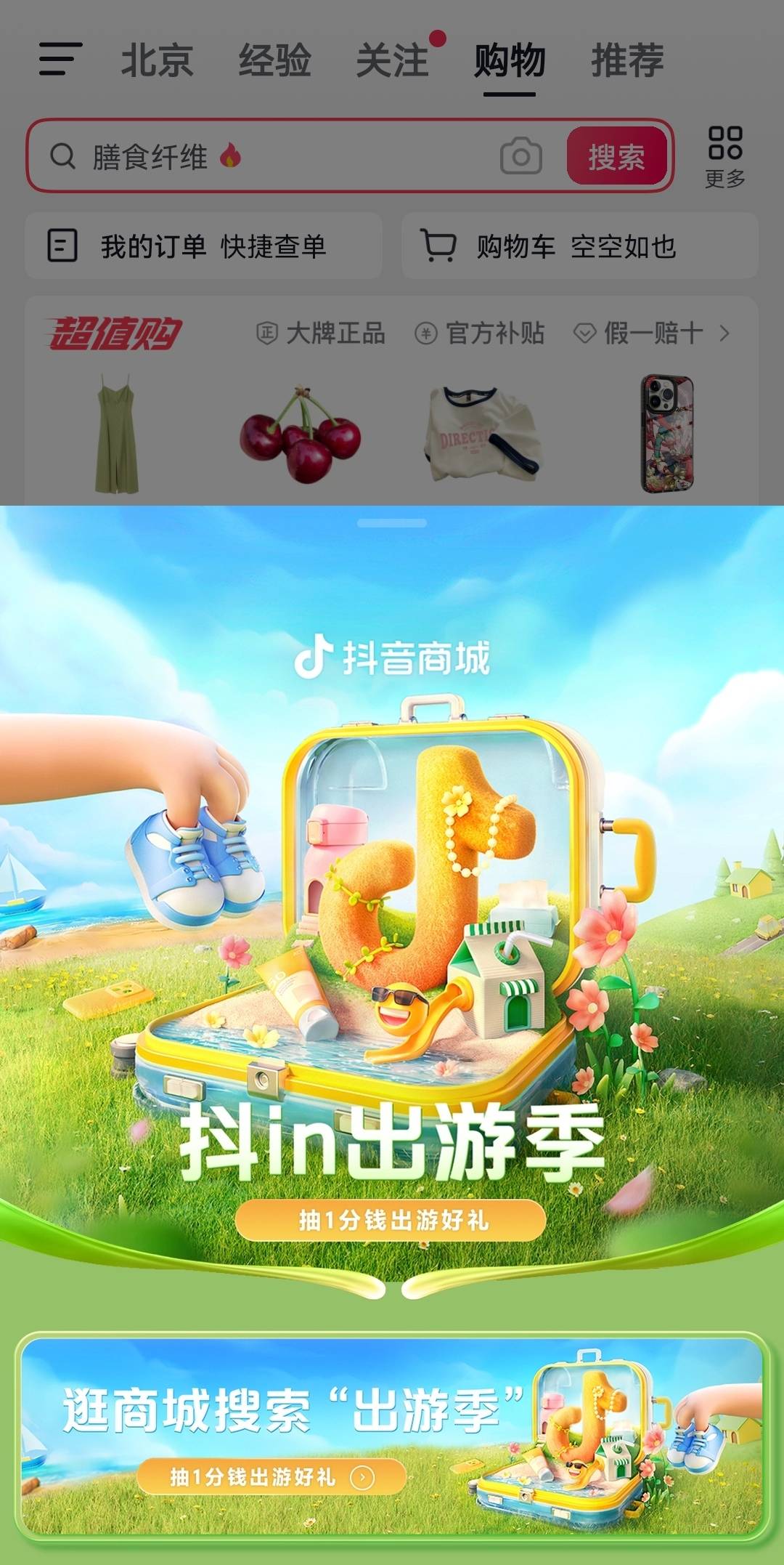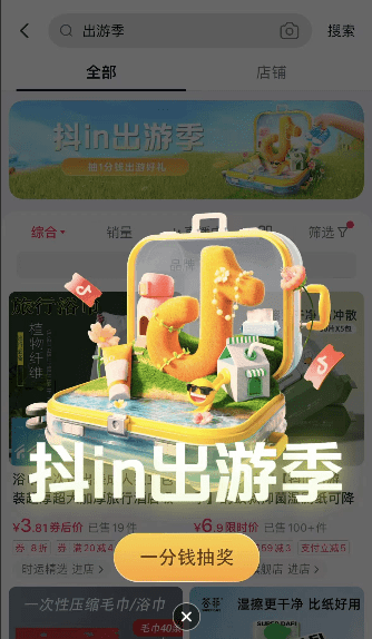 在频道合作层面,超值购、秒杀、品牌馆、直播精选是抖音商城促销活动重要阵地。电商促销活动的本质是打造有专属IP的心智窗口,通过绑定与节日特征相吻合的主题活动及对应玩法,系统化、规模化地扶持商家生意增长。其中,超值购是抖音商城长期促销频道,平台优选部分货品进行额外补贴,在频道内和搜索结果等用户消费场景进行分发,帮助商家在关键营销节点提质增效。秒杀则是商家通过限时限量的稀缺效应和商品优惠福利,实现用户拉新、带动更多商品销售的重要渠道,「抖in出游季」秒杀玩法包括爆款秒杀、频道满减、低价秒杀等方式,通过这些方式,很多商家实现了销售爆发。 国际乳品大牌佳贝艾特便是很好的例证。通过与「抖in出游季」联合,围绕“奇遇国民营养”“狂欢国王节”打造营销活动,以及超值购、商品券、新人券等多重玩法加持,佳贝艾特在4月27日当天,GMV环比提升523.67%,访客环比提升410%,商品曝光环比提升317%。 本次活动还通过“抽1分钱出游好礼”搜索彩蛋承接用户消费兴趣,为活动货品引流。当下,很多品牌和行业从业者的共识是“用户在哪,你就要去哪”,这意味着平台和商家要始终以用户为中心,而搜索是用户需求的重要体现。抖音电商也在和商家不停地探索“搜索+”的边界,此次活动推出了涵盖搜前引导、搜索彩蛋、搜索承接的完整链路,使得内容场景和货架场景能够协同,提高全域经营效率。