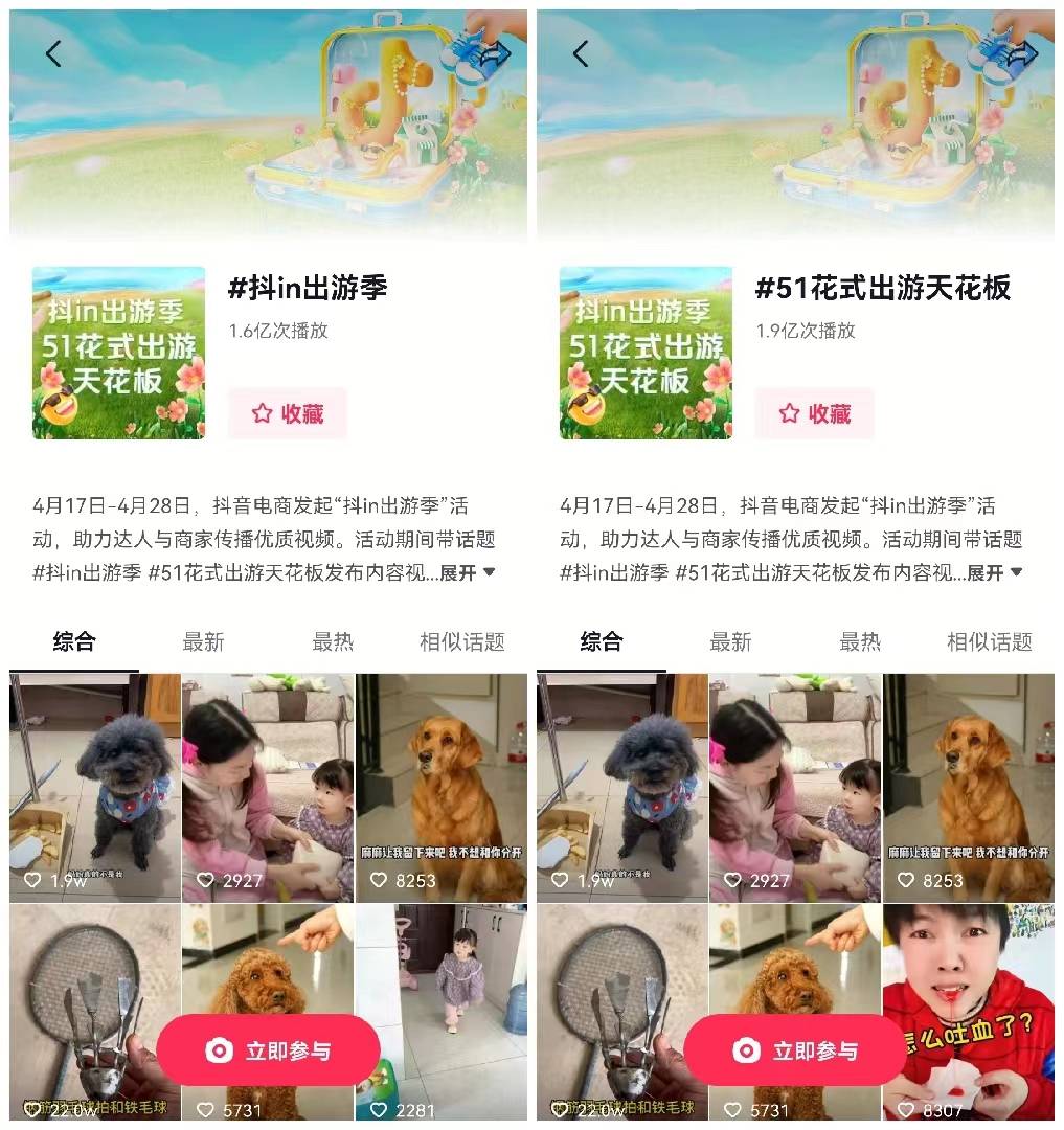 兴趣内容带动出游趋势,掀起春日消费热潮 对消费者来说,在旅游之前往往需要了解相关知识,便于其有条不紊地做好目的地选择和假期出游规划,而短视频、直播等内容形式能够带领消费者直观生动地感受旅游景点名胜、风土人情和特色美食,天然适合旅游相关产品种草。基于抖音生态特性,「抖in出游季」充分调动平台上的国内外达人资源,通过热门话题、明星达人直播引流和短视频种草等方式向用户展示产品特性,激发用户购买兴趣,同时为抖音商城引流、助力商家提升转化。 热门话题上,「抖in出游季」结合春季踏青出游需求和用户搜索偏好,推出#抖in出游季、#51花式出游天花板 话题,吸引用户关注、参与讨论。国内不同类型的明星达人围绕该主题持续输出多元场景化内容,如@颜如晶 推荐本帮菜、@黄圣依 换装、@辰亦儒 和小朋友一起走秀等,日本@熊本熊、俄罗斯@鹅国宇哥、荷兰@罐头瓶子在荷兰 等国外达人则根据自己的知识储备和本土生活经验,分享国外出游好地方、游玩攻略等内容。截至发稿,「抖in出游季」全网话题曝光总量超3.5亿。