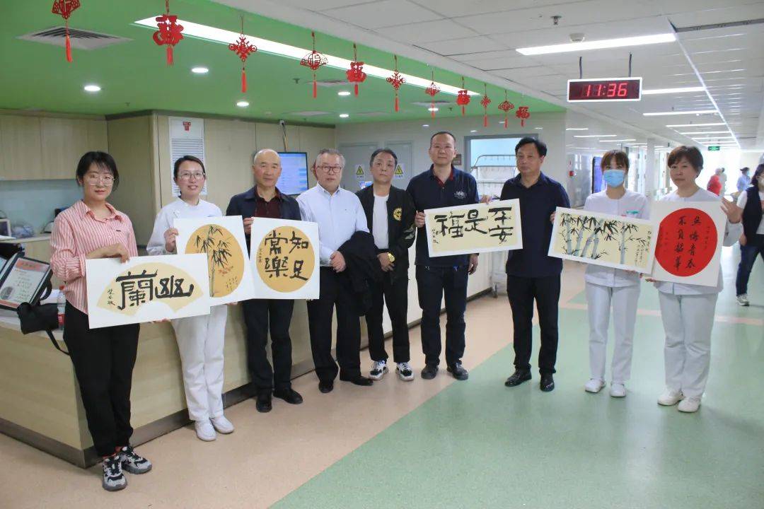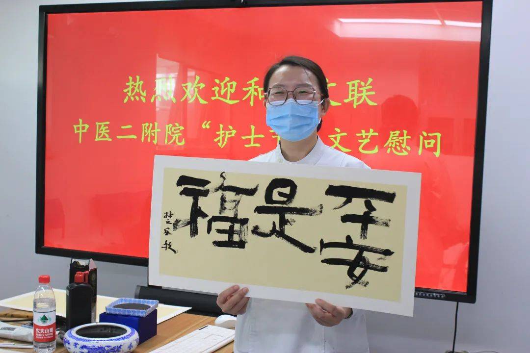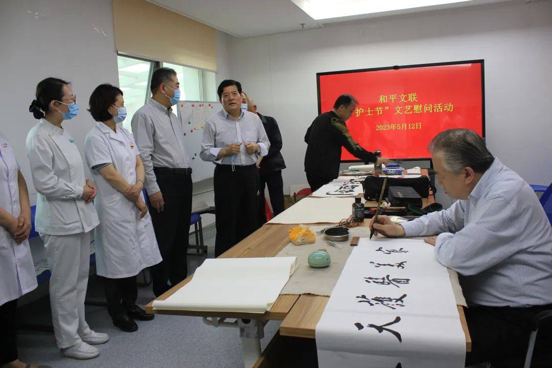 医心筑梦,大爱同行。在第112个国际护士节来临之际,贯穿“我们的护士,我们的未来”主题,以多样的文艺形式,丰富白衣天使精神文化生活,营造浓厚的艺术氛围,和平文联应中医二附院中医外科的邀请,5月12日上午,由和平区二级巡视员、文联主席李从军带队,在和平书协主席张同明、美协主席魏瑞江的大力支持协助下,组织著名书法家萧振华、楚岳牧,美协副主席何成,及文联干部,到院中医外科进行文艺慰问。这是和平文联“知民情、暖民心、惠民生”第6场文艺调研活动。中医二附院党委书记李正全,党委委员、副院长张朝晖,“津派疮疡”第四代传人、中医外科学科带头人张朝晖主任,及30多名医护人员,参加了活动。