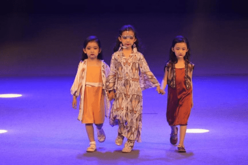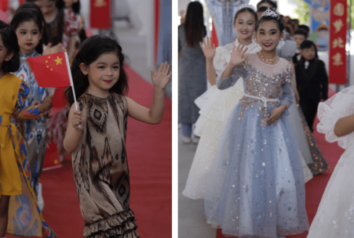 5月14日,小朋友们走过“新疆是个好地方”彩门,前往“六一”晚会演播厅。