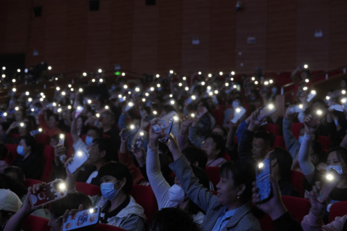 5月14日,“新疆是个好地方”暨“六一”大型少儿艺术电视展演现场,观众们热情地和台上演员互动。