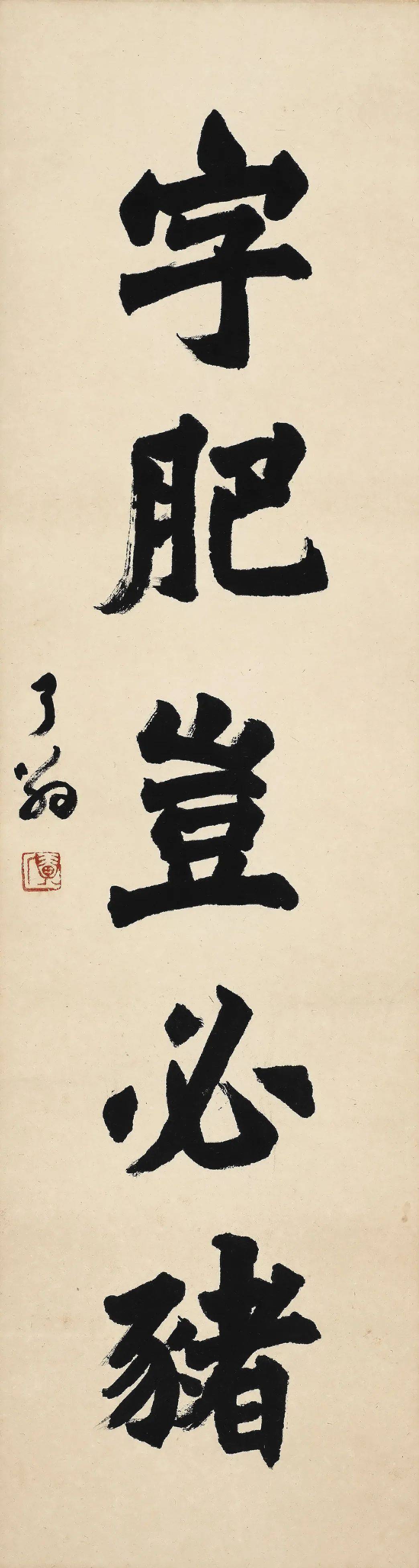 甲戌(1994)新年先生恵示手札称,"狗年,未闻有拍狗屁者,我倒戏作四句,录呈一笑:‘支辰十二犬今年,宠物声高价万千。无怪豪华歌舞地,女郎抱处望如仙。但说的都是洋狗,然则草狗哪里去了呢?不说也罢了。"在他眼中,生活无处没有诗材。今见他书两联,均与狗有关,其一:"室雅何须犬,字肥豈必猪",书法写得肥,素有"墨猪"之讥,然东坡有"肥瘦短长各有态,玉环飞燕谁敢憎?"句,此联看似粗俗,实乃雅切,含意深刻,表明了自己的书学观点,与东坡诗句有异曲同工之妙。其二:"腊尽春先在,家贫犬不嫌"则将狗之忠诚,刻划得淋漓尽致矣!先生主张对联要反对方妙,此处的"春"对"犬",虽同为名词,但词义不同,属反对之一例。