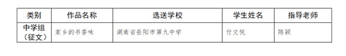 喜报!岳阳楼区一名中学生作品获“我的书屋我的梦”全国优秀作品奖(作者: 匡维维 )近日,2022年“我的书屋·我的梦”农村少年儿童阅读实践活动优秀作品名单,湖南省岳阳市第九中学学生付文悦的作品《家乡的书香味》(指导老师:陈颖)荣获征文优秀作品奖。据悉,岳阳楼区新闻出版局联合教育局精心策划,紧紧围绕迎接宣传贯彻党的二十大这条主线,依托社区(农家)书屋平台阵地,组织开展“我的书屋我的梦”农村少年儿童阅读实践活动,这次活动,同学们积极响应,踊跃投稿,共收到征文、书法、绘画、手抄报等稿件2000余篇(副),经过层层选拔推荐和专家评审,获得全国优秀作品奖1篇;省级优秀作品奖8篇(幅);市级优秀作品奖13篇(幅)。