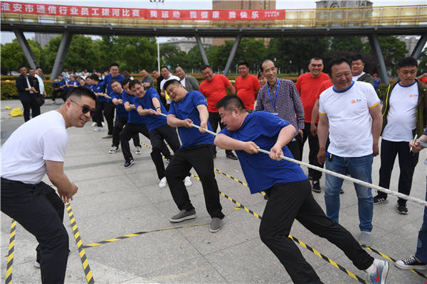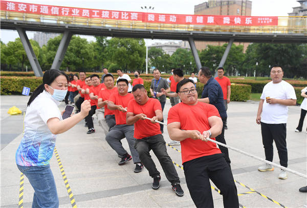 5月26日,淮安市通信行业协会举办了职工拔河比赛。此次比赛全体会员单位都以高度的热情,领导带头积极参与其中,赛场上激情澎湃,拉拉队摇旗呐喊,来自淮安电信、淮安移动、淮安联通、淮安邮政、淮安铁塔、淮安有线、淮安铁通、淮安网盈8支队伍,每组选手15人,个个都是实力相当,精心准备,经过多轮的激烈角逐,淮安铁通取得第一名的好成绩,淮安电信、淮安联通分获亚军、季军。通过此次拔河比赛,充分展现了淮安市通信行业人奋勇拼搏、团结奋进的活力风采。(桂宝林 摄)