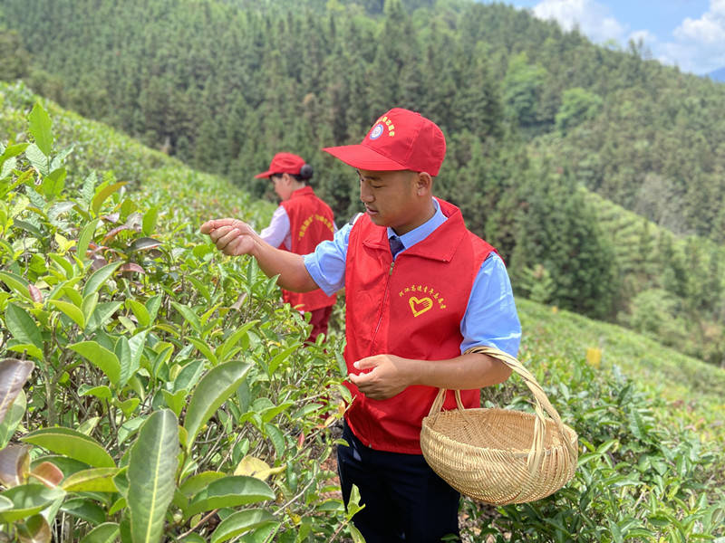 茶园露春色 志愿采茶忙 暮春渐远初夏来,正是采茶好时节。随着气温升高,尧山茶产业基地迎来了春茶采摘旺季,天峨收费站、坡结收费站志愿者们迅速投入采茶活动中。“用指甲掐芽尖,细挑独芽......”经过基地茶农的简单的培训后,一个个身着红马甲、手提小竹筐的青年志愿者纷纷走入茶园化身“茶农”穿梭于茶树丛中。大家干劲十足,小心翼翼地穿梭在茶园中采摘嫩芽,一丝不苟,力争把采茶工作做到最细致。一抹抹志愿“红”与茶叶“绿”交相辉映,成为春日里一抹亮丽的风景。看着一个个满载而归的志愿者,茶农们脸上露出感激的笑容。
