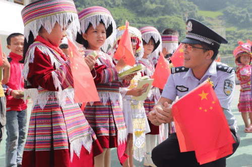 民警为少数民族儿童发放国旗。蒙正欢 摄