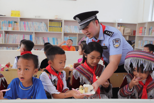 民警与少数民族儿童分享爱心蛋糕。蒙正欢 摄