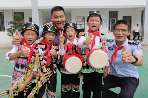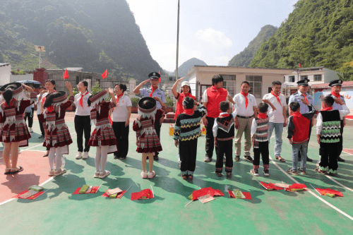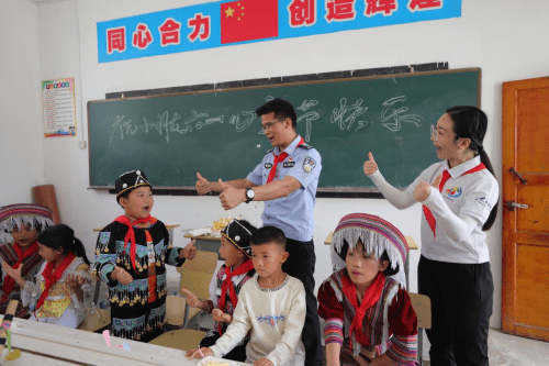 少数民族留守儿童为民警佩戴红领巾。蒙正欢 摄