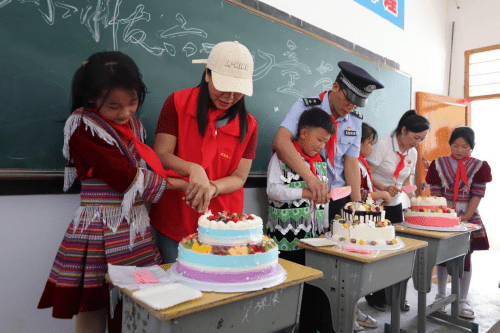边境少数民族儿童与民警们共同切蛋糕。蒙正欢 摄