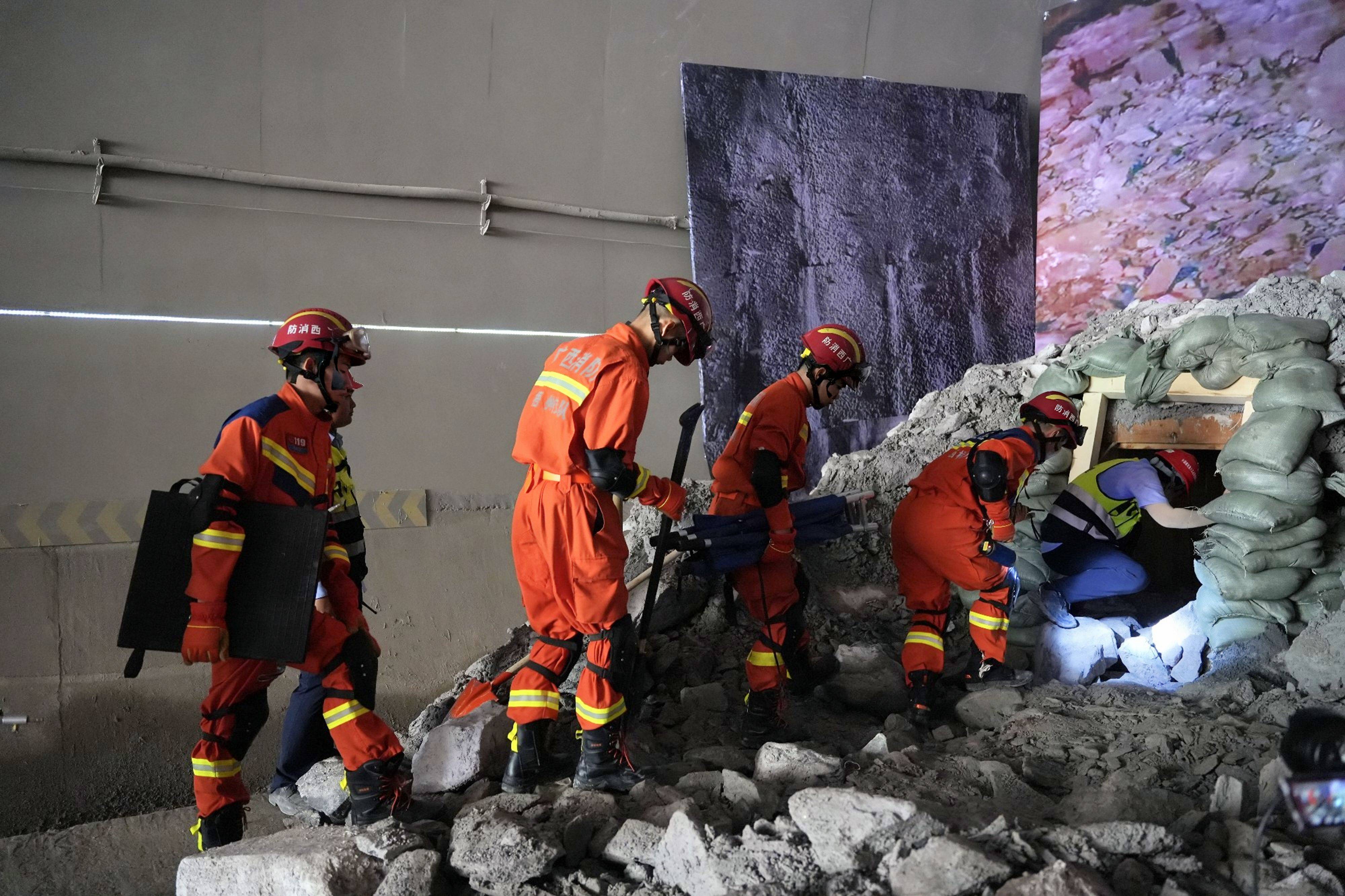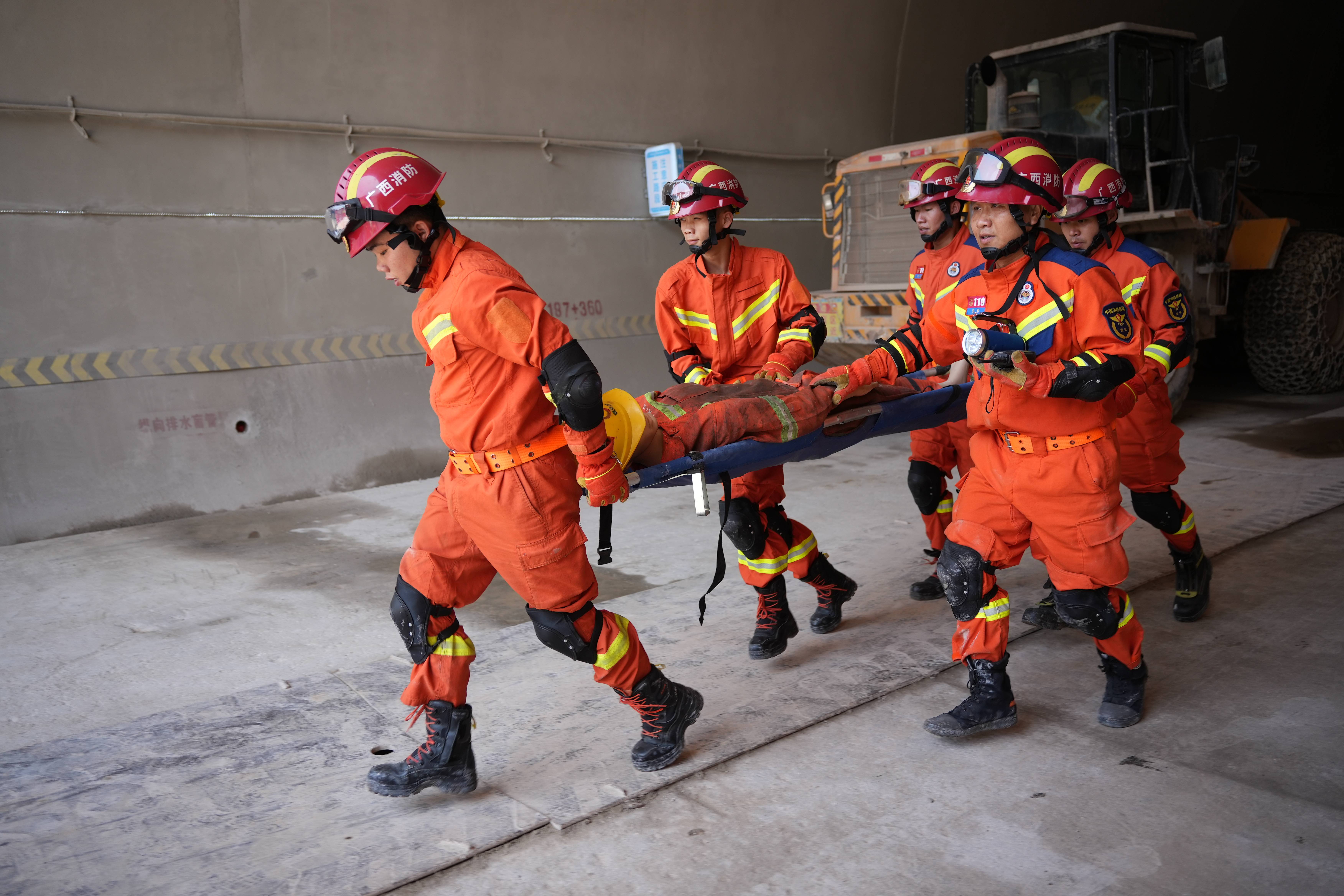 演练模拟了柳梧铁路七标项目凤岭隧道因连日降雨造成雨水渗透,洞内拱顶出现大量石块掉落和大面积的拱顶塌方,导致工友涉险受困而展开的救援场景。接到事故报告后,现场按照信息上报与响应启动、项目经理部先期处置、联合救援处置、响应终止及后期处置四大程序进行,6个应急处置小组快速反应、应对及时,科学有序开展救援工作。