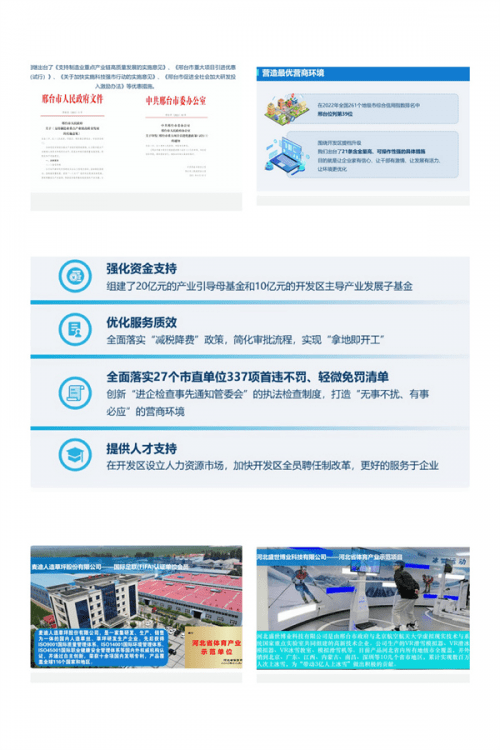 营造最优营商环境 在2022年全国261个地级市综合信用指数排名中邢台位列第39位;营造最优营商环境,围绕开发区提档升级,我们出台了21条含金量高、可操作性强的具体措施,目的就是让企业家有信心、让干部有激情、让发展有活力、让环境更优化,强化资金支持,组建了20亿元的产业引导母基金和10亿元的开发区主导产业发展子基金,优化服务质效,全面落实“减税降费”政策,简化审批流程,实现“拿地即开工”,提供人才支持,在开发区设立人力资源市场,加快开发区全员聘任制改革,更好的服务于企业。