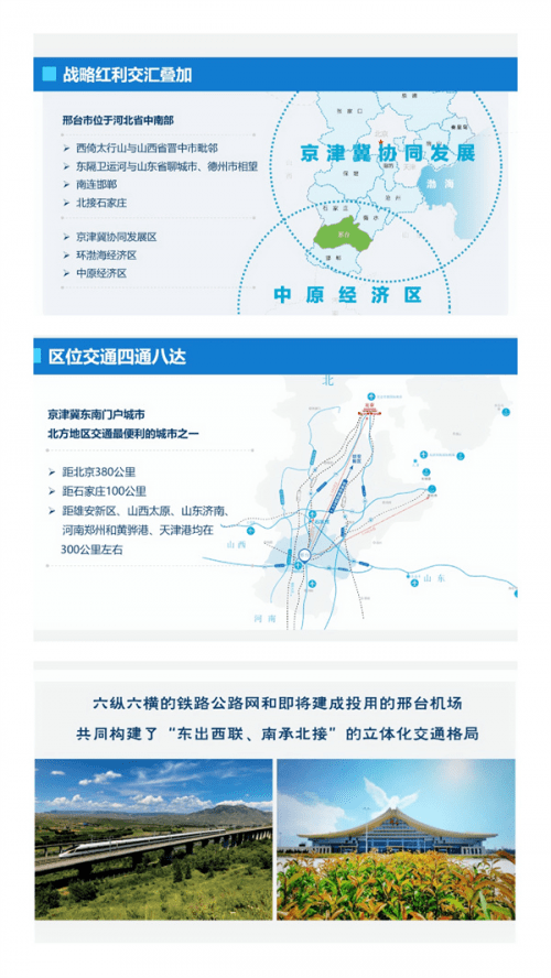 战略红利交汇叠加。邢台位于河北省中南部;西倚太行山与山西省晋中市毗邻;东隔卫运河与山东省聊城市、德州市相望;南连邯郸;北接石家庄,京津冀协同发展区;环渤海经济区,中原经济区;区位交通四通八达,距北京380公里,距石家庄100公里,距雄安新区、山西太原、山东济南、河南郑州和黄骅港、天津港均在300公里左右;六纵六横的铁路公路网和即将建成投用的邢台机场共同构建了“东出西联、南承北接”的立体化交通格局!