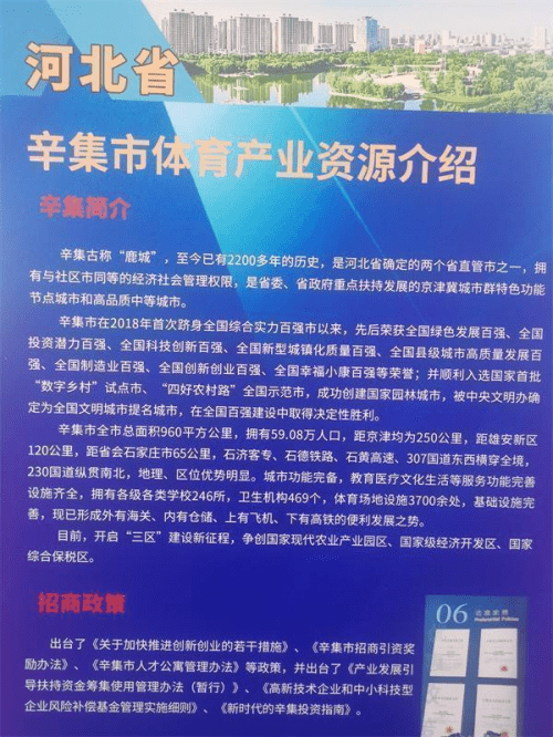 4辛集特色资源 辛集皮毛,历史悠久,享誉海内外 辛集市是国家命名的“中国皮革皮衣之都”,是全国最大的绿色生态皮革生产基地,被列为省首批重点示范产业集群。 辛集国际皮革城被评为国家3A级景区 每年举办的中国国际皮毛时装博览会(BEIJING FUR),区域品牌价值132亿元 第二章节 辛集市招商 营销环境 完整准确全面贯彻新发展理念,创新制定招商引资奖励办法和创新创业支持措施,出台了辛集市稳定经济运行保持经济增长的四十条措施及配套措施和十七条接续措施,开展全市企业“大走访、大调研、大帮扶”活动。 体育产业资源 辛集市积极倡导全民健身理念,建设1000余处各类全民健身场地设施,其中投资2440万元的滑冰馆开始运营,投资3亿元的澳森全民健身中心各项实施工程稳步推进,年底投入使用。 辛集市澳森全民健身中心项目是我市全面贯彻落实全民健身国家战略,加快推进全民健身公共服务体系建设的具体举措,是市委、市政府确定的体育惠民工程。 辛集市现有三百多家从事体育产业的企业和个体户,其中规模以上的企业有运动悬浮地板和冰雪运动服装、手套等 各种体育赛事活动不断,其中有影响力的品牌赛事有“河北省青少年篮球比赛”和“半程马拉松”比赛