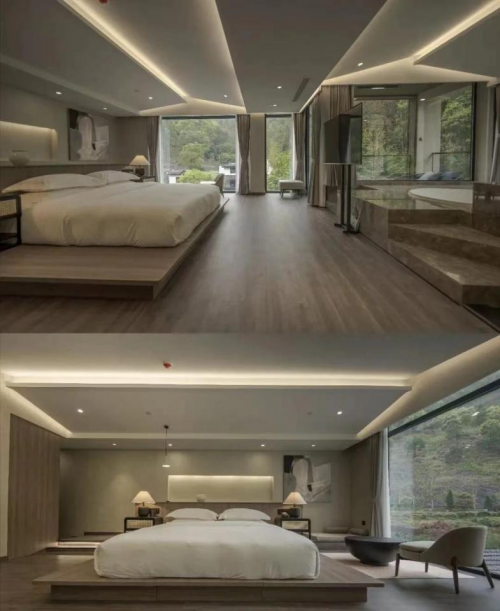 青山环绕,绿树成荫。建德“谷雨山居”就隐藏在美丽的新安江森林公园之中,地处浙江省建德市新安江街道横坑坞。距国家AAAAA级风景区千岛湖只隔一条隧道,乘建德市区城市公交1路车到横坑坞路口再步行5分钟就到达,建德城区自驾只需3分钟车程。 “谷雨山居”设计灵感源自古代篆书元素,全智能、全山景。拥有山景、园景、亲子、家庭、商务等房型、大幅玻璃窗和观景阳台更是将山野度假松弛感直接拉满。大床房,舒适的吊椅和视野广阔的山景浴缸让人很难不对它印象深刻;亲子房,标准的双人床加上榻榻米床,挂在窗上的小巧御守,还有多样式的浴衣等等都是设计的用心之处,让你感受到深山老林中的深幽与静谧,人在室内也能与大自然亲密接触。