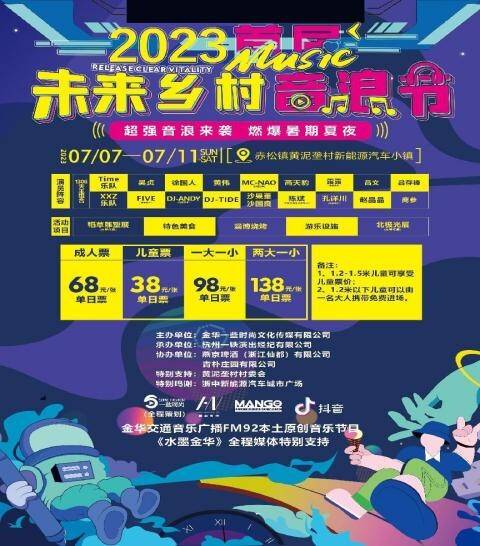 这是一场属于音乐、美食、啤酒、灯光的狂欢盛宴。 也是集时尚、潮流、娱乐、梦幻为一体的夏日派对。 如果没有去过淄博“赶烤”,不要遗憾,这次音浪节还有淄博特色烧烤, 一定不要错过浙中新能源汽车城市广场的“补烤”哦! 一直持续至7月11日,掀起舞台热浪,开启夏日狂欢新模式,你准备好了吗? 主办单位:金华一些时尚文化传媒有限公司 承办单位:杭州一轶演出经纪有限公司 协办单位:燕京啤酒(浙江仙都)有限公司 青朴庄园有限公司 特别支持:黄泥垄村村委会 特别鸣谢:浙中新能源汽车城市广场 活动地址:浙中新能源汽车城市广场 演出时间:18:00——22:00(4个小时演出时长) 金华交通音乐广播FM942本土原创音乐节目,《水墨金华》全程媒体特别支持。 还可关注FM942微信公众号,了解2023未来乡村音浪节最新动态。 【艺人阵容】