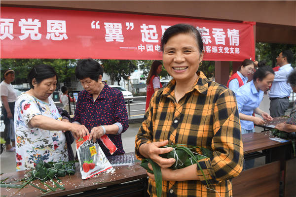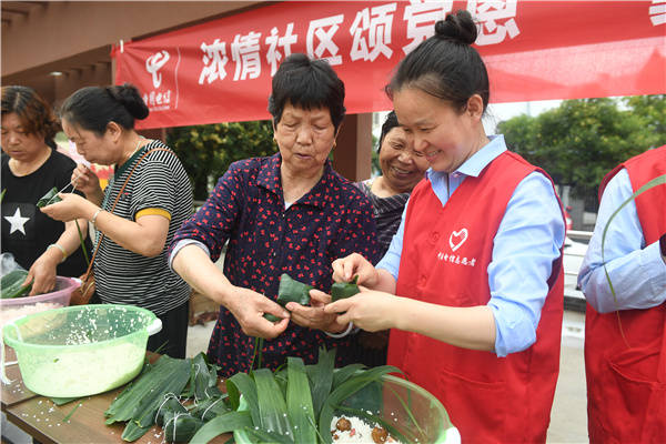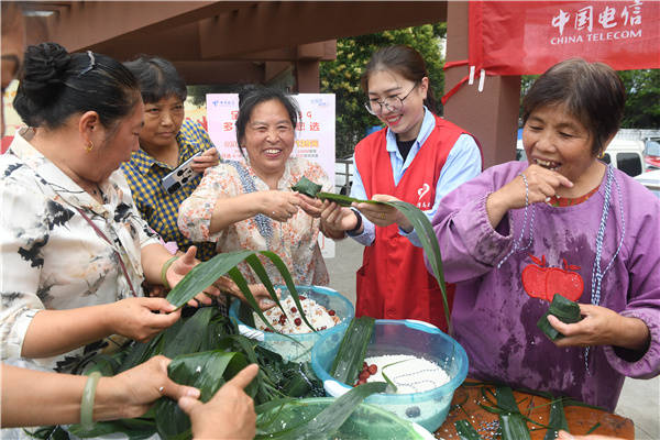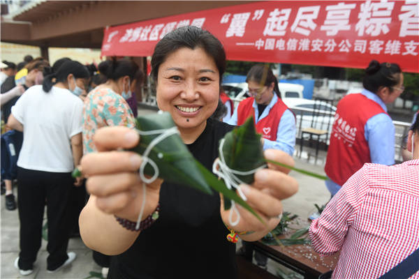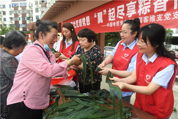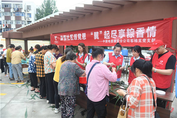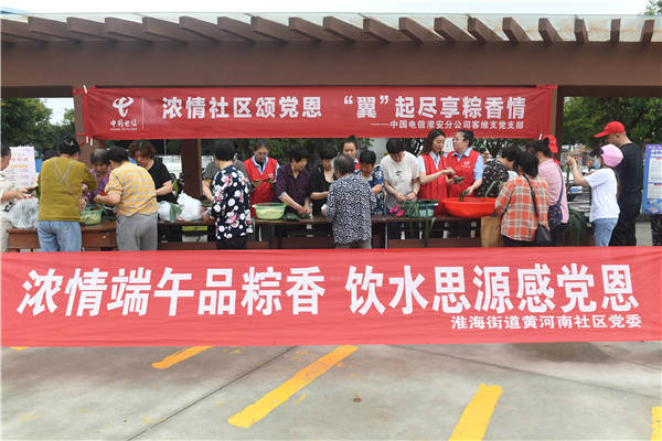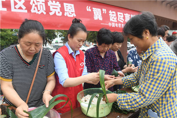 6月19日, 中国电信淮安分公司客户维护支撑党支部党员、团员联合清江浦区淮海街道黄河南社区党委,到健康新村新时代文明实践广场与社区居民开展“浓情社区颂党恩“翼”起尽享粽香情”庆端午活动。党、团员们与社区居民一起包粽子、话民俗、让居民感受到了浓浓的传统文化氛围,在说笑中体验着传统文化的魅力与快乐,欢乐迎端午。 桂宝林 孙信政 张晓梅摄