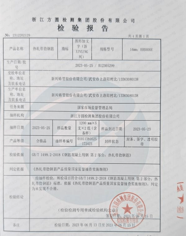近日,新兴铸管股份有限公司武安本级收到浙江方圆检测集团股份有限公司产品质量国家监督抽查螺纹钢抽检检验报告。报告结论为:经抽查检验,所检项目均符合GB/T1499.2-2018《钢筋混凝土用第2部分:热轧带肋钢筋》标准,依据《热轧带肋钢筋产品质量国家监督抽查实施细则》(2023年版),判定全部合格,顺利通过2023年产品质量国家监督抽查。