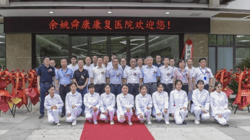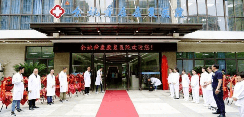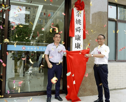 余姚市政协副主席朱光煦和市卫健局局长李斌为康复医院揭牌