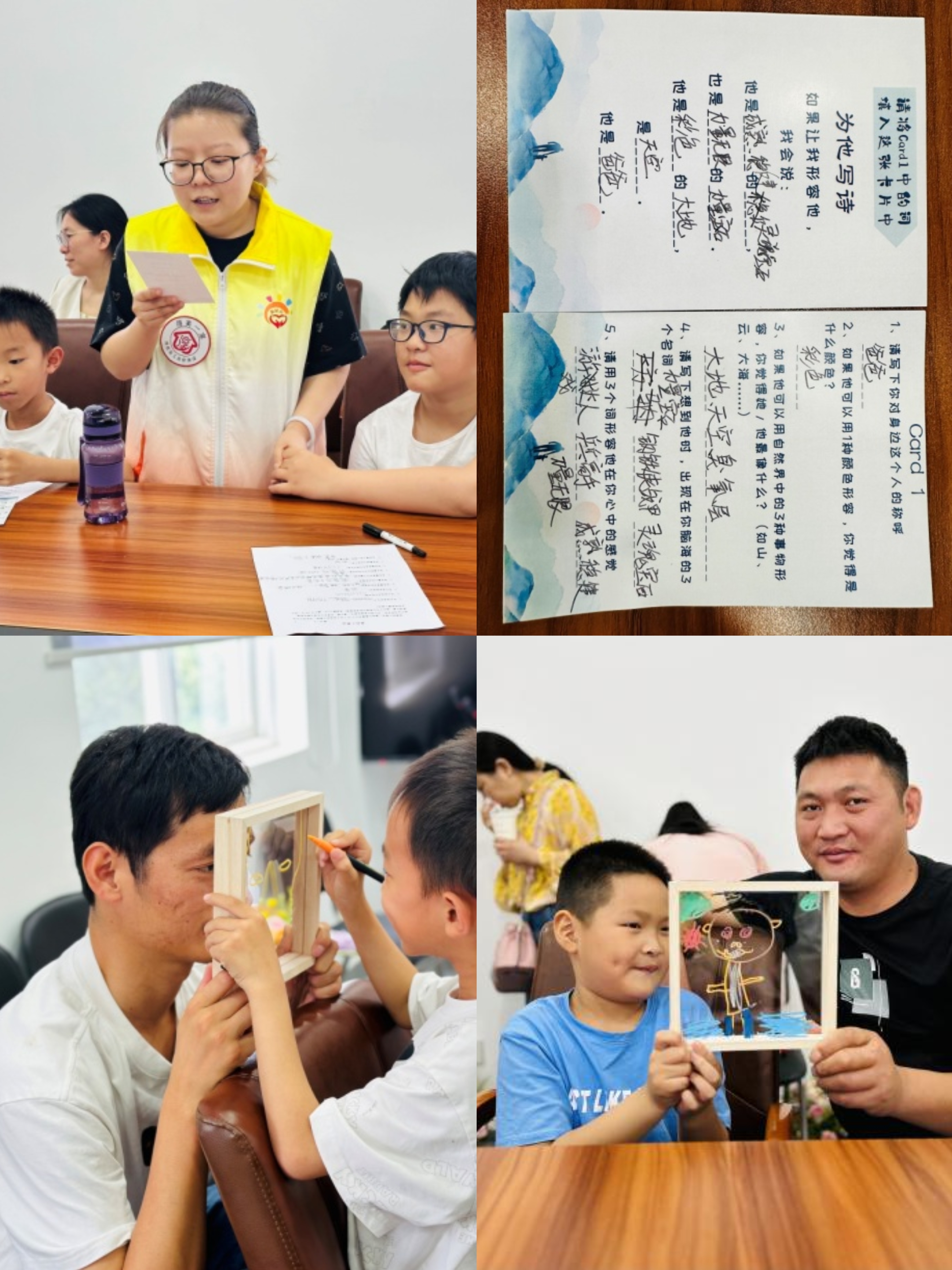 孩子们还不忘以填词的方式为父亲作起感恩的诗,大家依次分享,有的把父亲比作大海、高山、宝石、大地,也有的把父亲比作鲜花、阳光、云朵,父亲们听到孩子们的真情流露,都露出了欣慰的笑容。孩子们还透过画布和父亲对视,给自己一个安静的时间和空间,认真仔细地观察自己的父亲,并用画笔画下他们的模样,孩子们创造力得到发挥的同时,更加加深了对父亲的认识。