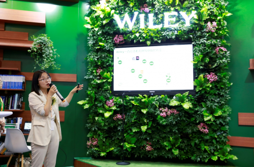 威立今年的展台以绿色为主要视觉元素,通过使用绿色植物和花墙为布展场景,突出环境保护和可持续发展的理念。威立共展示了超过800本书籍和在线学术资源平台Wiley Online Library,并首次举办了 “科研日” 系列活动,将教育和科研融合展示。