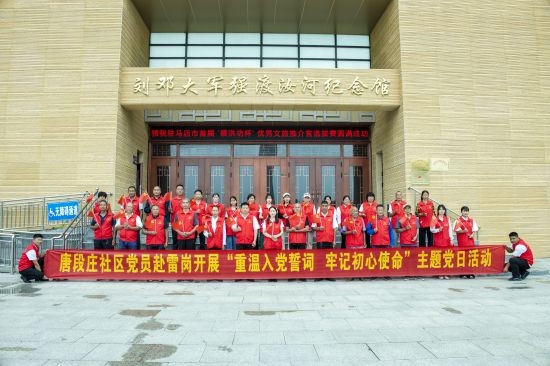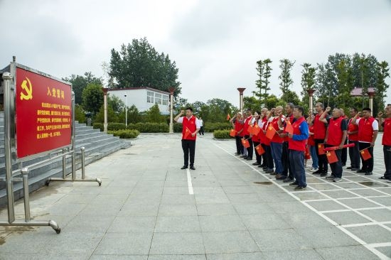 6月25日,在刘邓大军雷岗血战纪念碑前,清源街道唐段庄社区党支部书记郑亮带领支部20多名党员重温入党誓词。