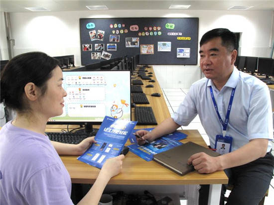 图为田朝到小学走访了解机房搬迁情况,并向学校信息中心主任介绍新业务 桂宝林 张晓梅 摄 |