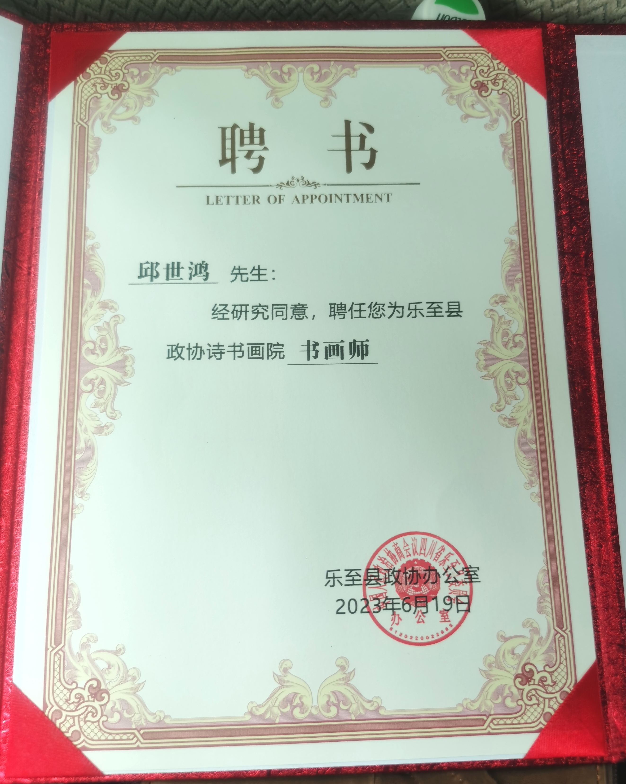 21日,在乐至县南湖公园内,举行了隆重的揭牌仪式。诗书画院独立二层楼,展厅及笔会处俱宽松。嘉宾云集,胜友鱼贯,乡音识客,品茗交心。开幕式隆重,我等数人被聘为书画院书画师,颁证存档。展览作品提供二篆书对联。